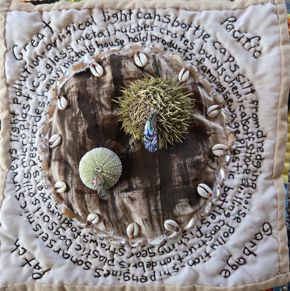 I have had these urchins for some time. I’ve known that I wanted to make a piece with them, but I wasn’t sure how I wanted to do that. The urchin above was cleaned of it’s spikes, and the one underneath was not cleaned. I want to make some statement with it, but I’m not sure what that would be right now. I’ve just put them on the fabric I would like to use and placed them near my work space to think about how I want to work with them. This incubation (thinking) period is really important. When you spend as much time making work as I do, you want to make sure you are making things that excite you.